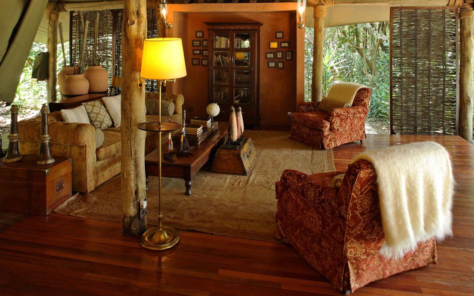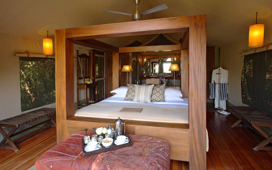 When the dawn chorus of birds and monkeys begins outside, a gentle knock on the door brings a morning tray of steaming coffee. Step out of your elegant tented suited onto the private veranda outside and watch the bush around you come to life. The ensuite bathroom with its stone shower and warm wood furnishings prepares you for the day’s adventure. While away an hour or two in the deep leather chairs on the veranda, looking out onto the endless African plains. On a hot day, swap the shade of the forest for a dip in the sparkling lap pool.