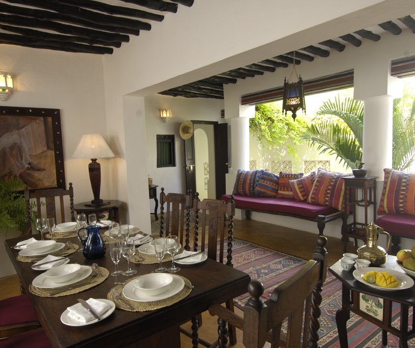 Old Lamu doors open into a hall and an open inner courtyard edged by a baraza sitting and eating area.