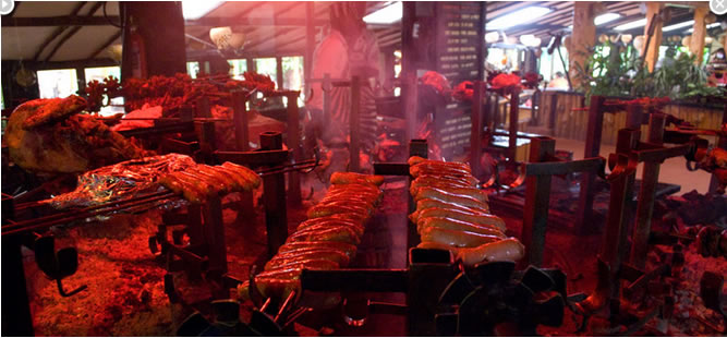 The feeding frenzy doesn’t stop until defeat is declared by the over-fed guests who signal that enough is enough by lowering of a white paper flag perched atop the central tray. This is followed by dessert and coffee. The full meal including a soup course is at a set price. A vegetarian menu is also offered. First time visitors to The Carnivore are enthralled by the spectacle of the roasting pit, the service and the distinctive flavours of food.
