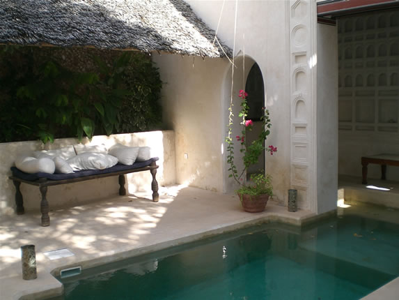The main door, carved locally, repeats the traditional Swahili designs, and opens to the interior courtyard, with the dining and the swimming